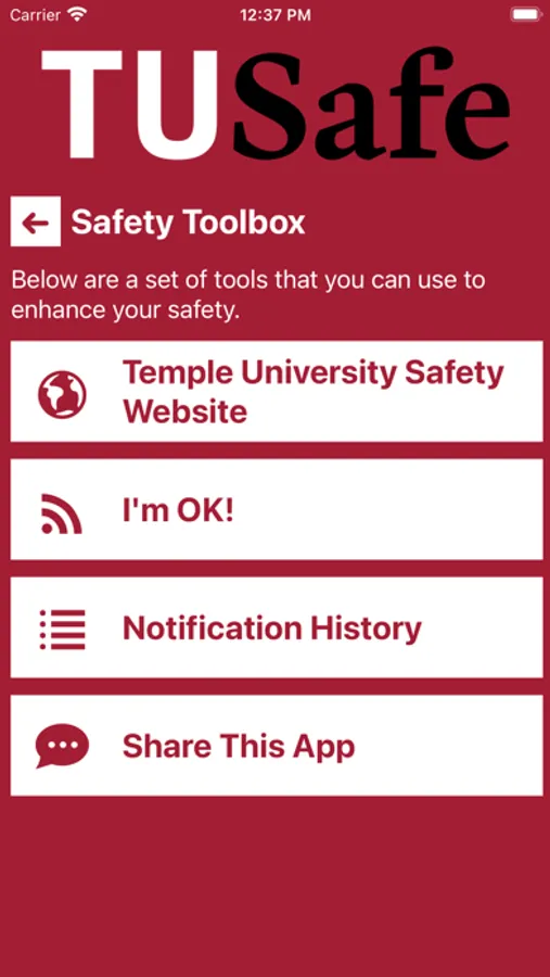 TUSafe is the official safety app of Temple University. It is the only app that integrates with Temple University's safety and security systems. Public Safety has worked to develop a unique app that provides students, faculty and staff with added safety on the Temple University campus. The app will send you important safety alerts and provide instant access to campus safety resources.