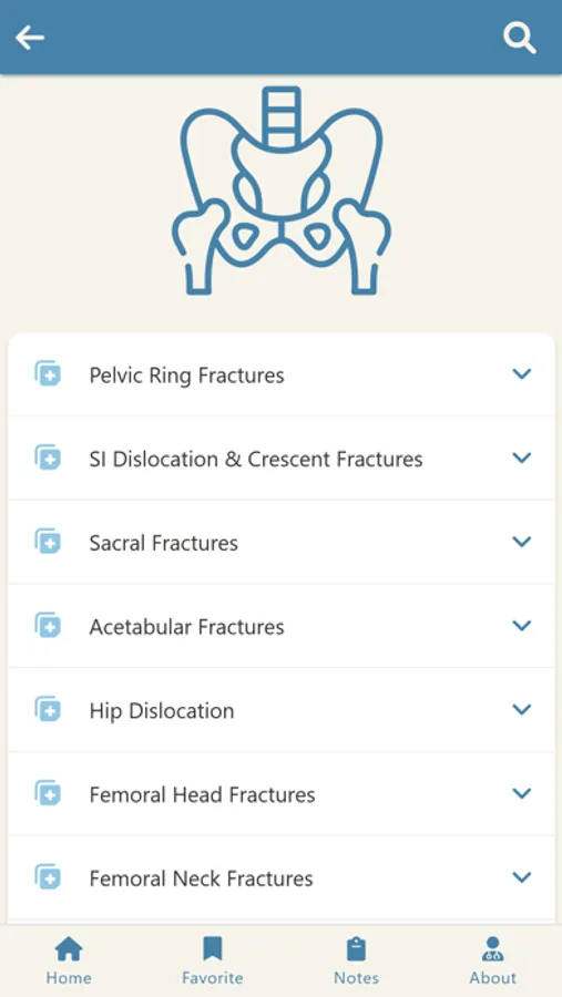 The Orthopedic Indications app contains many clinical cases and fractures distributed according to the region and the nature of the disease.