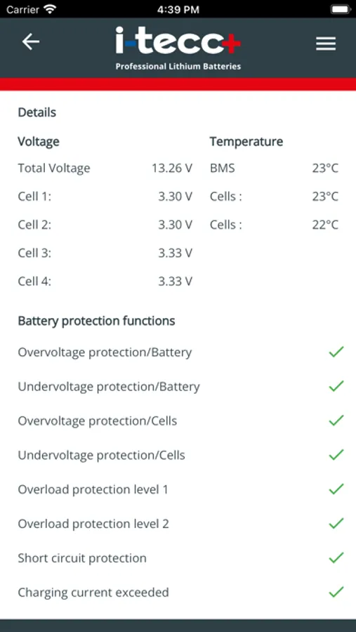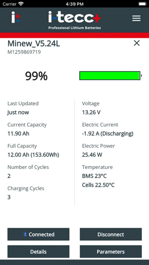 i-tecc+ BMS is the perfect tool to get important information about your i-tecc+ LiFePO4 batteries, such as current state of charge, battery capacity, power consumption, temperature, charge cycles and much more.