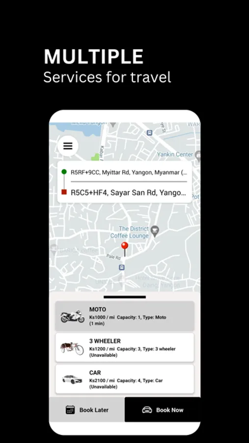 Various Ride Options: Choose from a range of ride options to suit your needs and budget, including standard sedans, spacious SUVs, and eco-friendly hybrids.