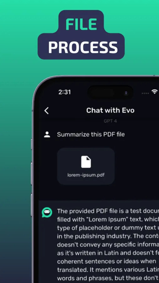 File Recognition: Upload documents and let Evo provide insights, summaries, and much more.
