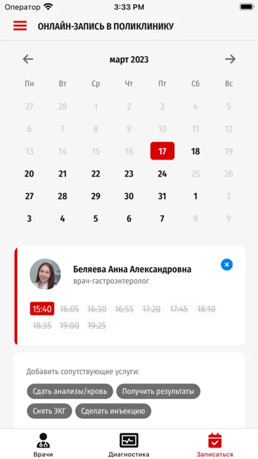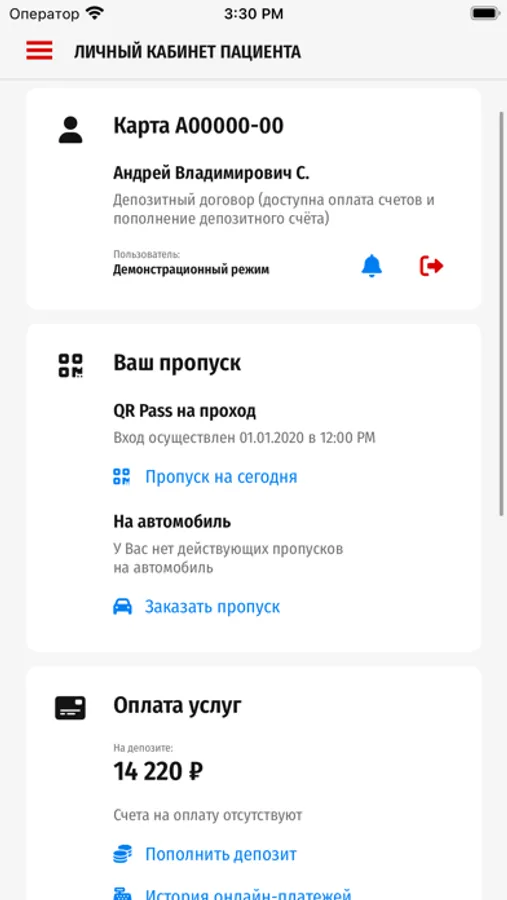 Запись на консультацию врача и диагностику с уникальной функцией планирования визита к нескольким специалистам в один день. Онлайн-заказ пропуска на автомобиль, онлайн-оплата, электронный QR пропуск на территорию.