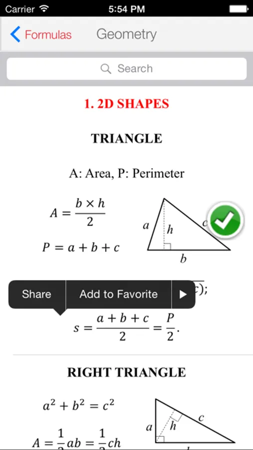 - Search function: in each category, type on Search bar to quickly get a formula.