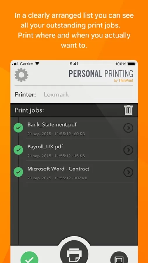 Initiate print jobs easily with your iOS device. ThinPrint Personal Printing is an innovative, cost-effective and secure pull-printing solution which allows you to print flexibly to any printer in your corporate network. Simply equip your printers with stick-on bar codes – no additional hardware or specific printer models are required.