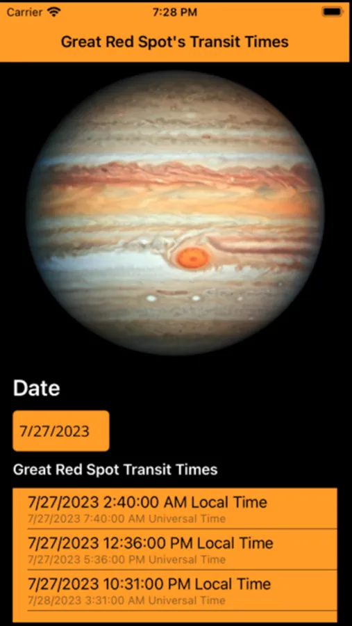 Local & Universal Time: Transit times are in both local time and universal time, ensuring you never lose track of the perfect moment to witness the Great Red Spot's beauty, whether you're at home or exploring the world.
