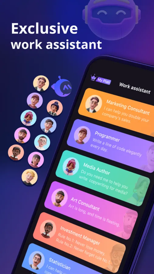 - A variety of job assistants, including marketing consultants, programmers, media writers, art consultants, investment managers, statisticians, real estate agents, hiring managers, financial analysts, career counselors, accountants, CEOs , automotive engineers, etc.
