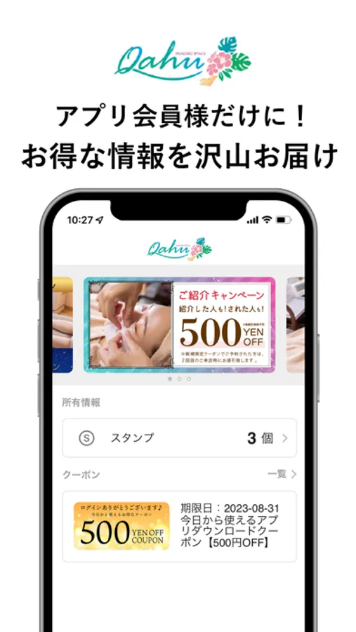 アプリを通して【Healing Space Oahu】の新着情報やお得な情報を受け取ることができます。また、いつでもお手元のスマートフォンから、メニューやご希望のお時間帯のチェック・ご予約などが可能です。アプリをインストールしていただくことにより、【Healing Space Oahu】をより便利に身近にご利用していただけます。