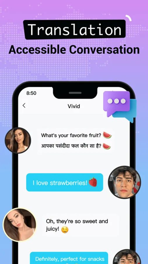 **Intelligent Translation**: Say goodbye to language barriers. Vivid's smart translation feature ensures seamless real-time communication with friends across the globe. Express yourself freely and share your thoughts without being limited by language differences.