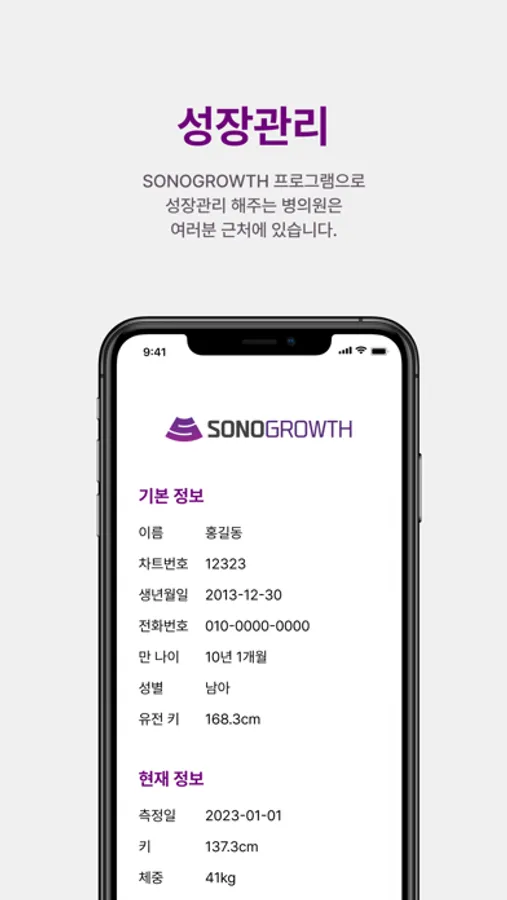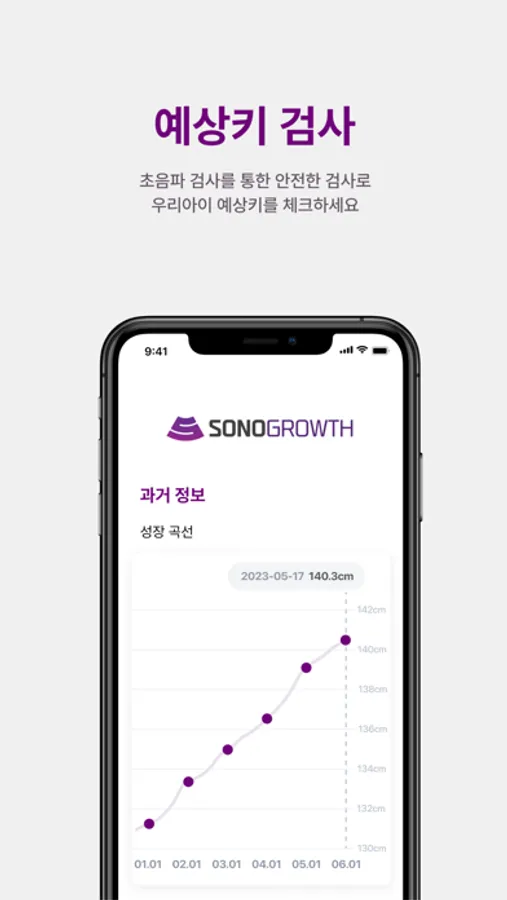 소노그로스는 초음파 기기를 이용한 최신 진단 기법을 통해 우리 아이의 성장상태를 객관적으로 분석합니다. 우리 아이의 성장 상태를 방사선 노출 없이 안전하게 측정한 후 소노그로스 앱을 통해 언제 어디서든 확인하세요.
