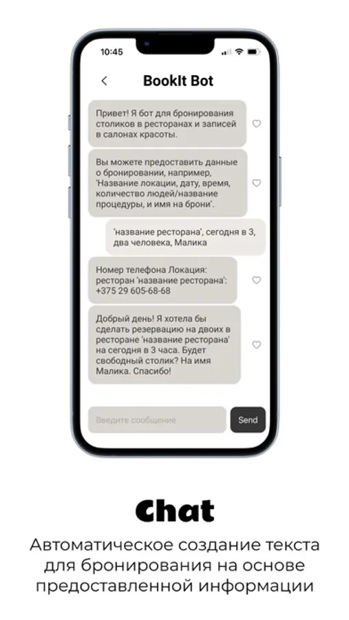 BookIT AI - это ваш личный ассистент по бронированию, готовый помочь вам найти и забронировать столик в ресторане или записаться в салон красоты. Наш интуитивно понятный и легкий в использовании интерфейс позволяет вам вводить данные бронирования в любом удобном формате - текстом или выбирая из предложенных опций.