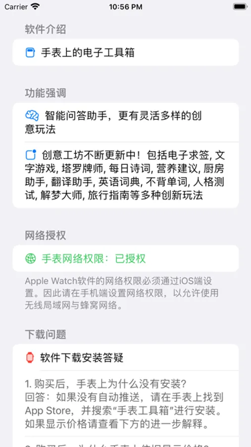 手表工具箱,手表上的生活效率工具。电子求签, 文字游戏, 塔罗牌师, 每日诗词, 营养建议, 厨房助手, 翻译助手, 英语词典, 不背单词, 人格测试, 解梦大师, 旅行指南等多种创新玩法。