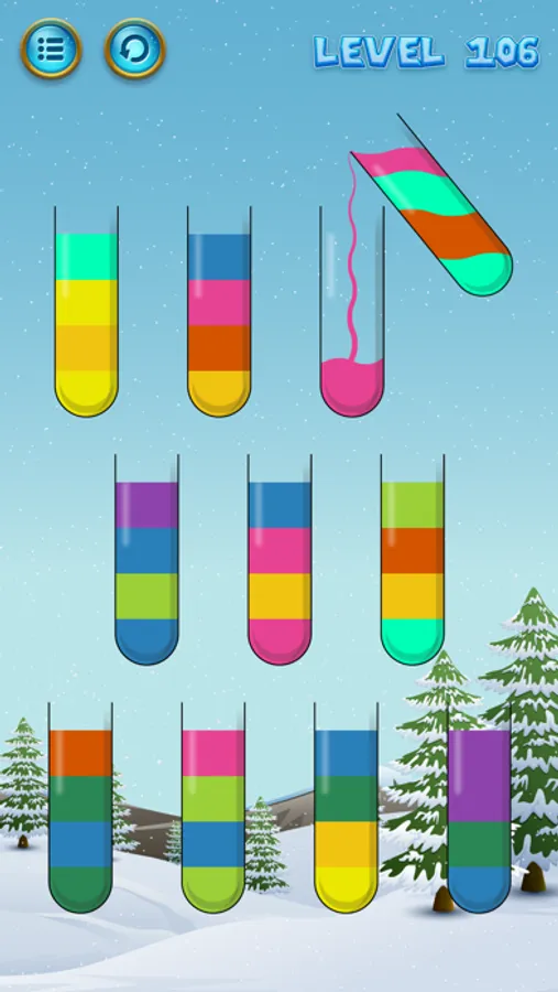 ⇒ Utilize hints if you get stuck, sort all colors & progress onto the next level