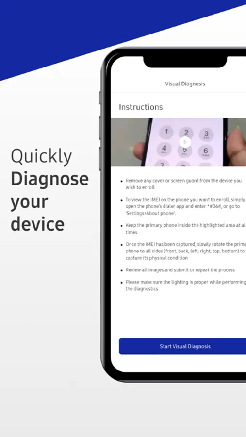 To begin the diagnosis, you must receive a valid activation code via email. Once received, you can begin the diagnostic process. You'll need a second smartphone or tablet to capture images of your enrolled device for the diagnosis. The app will walk you through the diagnostic instructions, ensuring that you capture all of the required images correctly.
