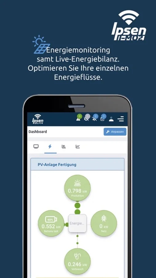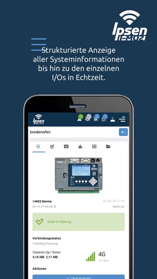 Die Ipsen I-Mo App (Ipsen Mobile Monitoring) erleichtert Ihnen die mobile Nutzung des Ipsen I-Mo Portals. Mit einem Klick auf Ihrem Smartphone oder Tablet steht Ihnen der gesamte Ipsen I-Mo Funktionsumfang zur Verfügung. Je nach Endgerät passt sich die Anzeige voll responsive der möglichen Bildschirmgröße an. So erhalten Sie immer den optimalen Überblick und genießen die volle Funktion auf allen Endgeräten.