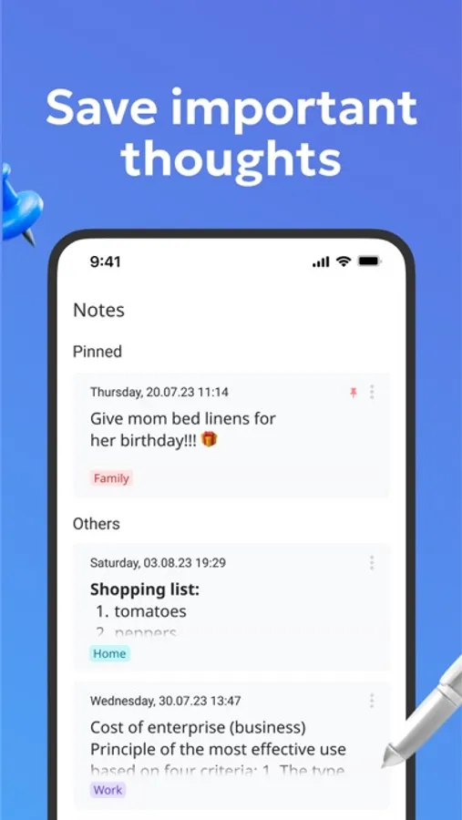 Ikiteo serves as your digital stock of thoughts and ideas. No more losing or forgetting important information, goals, or observations. Jot down your notes, dreams, and insights. Pin the most relevant notes to the top, making sure they're always visible and easily accessible whenever you need them.