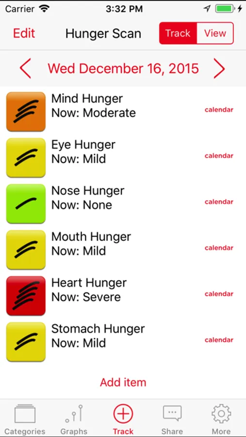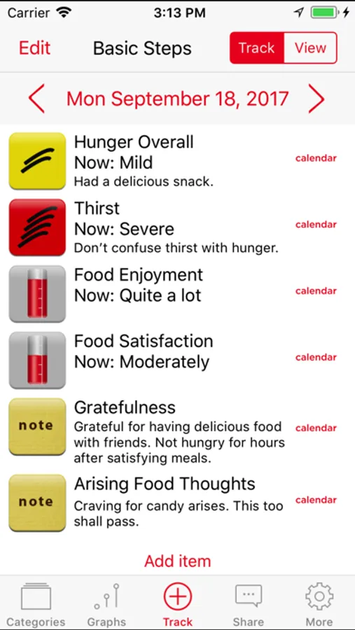This app helps by building awareness of different types of hunger. It also supports doing-thinking, e.g., you can track time set aside for eating, time exercised, and if you need to, track weight.
