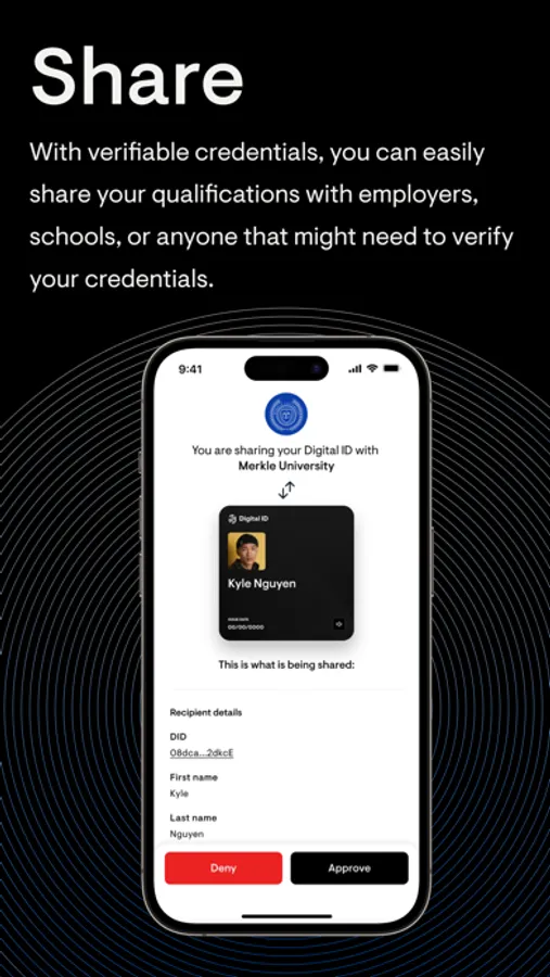 Share: With verifiable credentials, you can easily share your qualifications with employers, schools, or anyone that might need to verify your credentials.