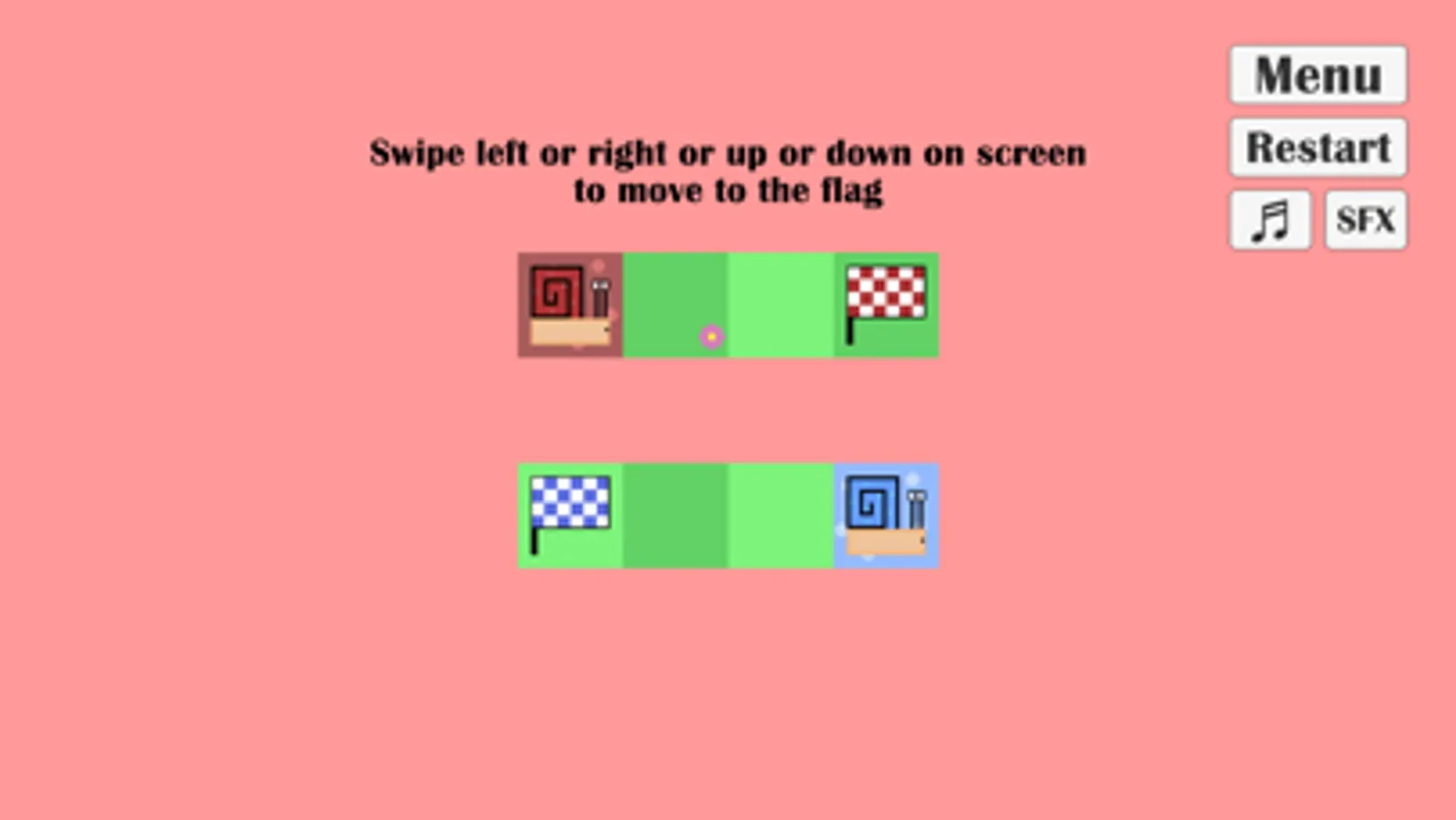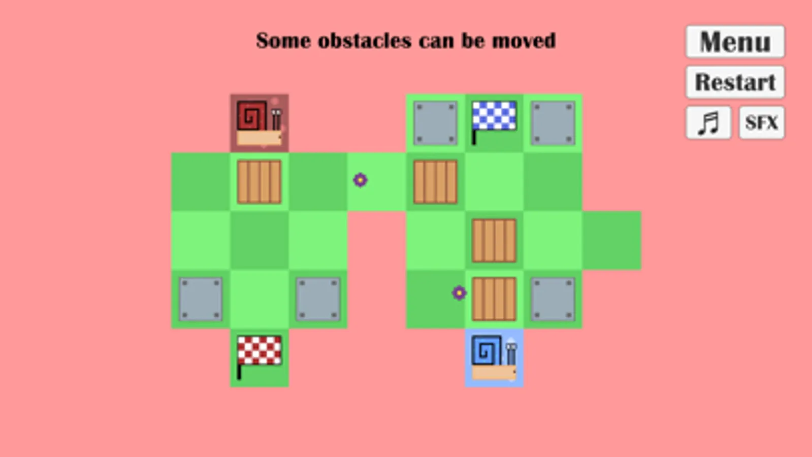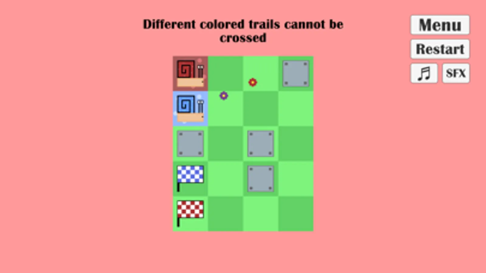 Snail Trail is a short puzzle game where you control two different colored snails. The goal is to have both snails reach their respective flag while getting around obstacles.