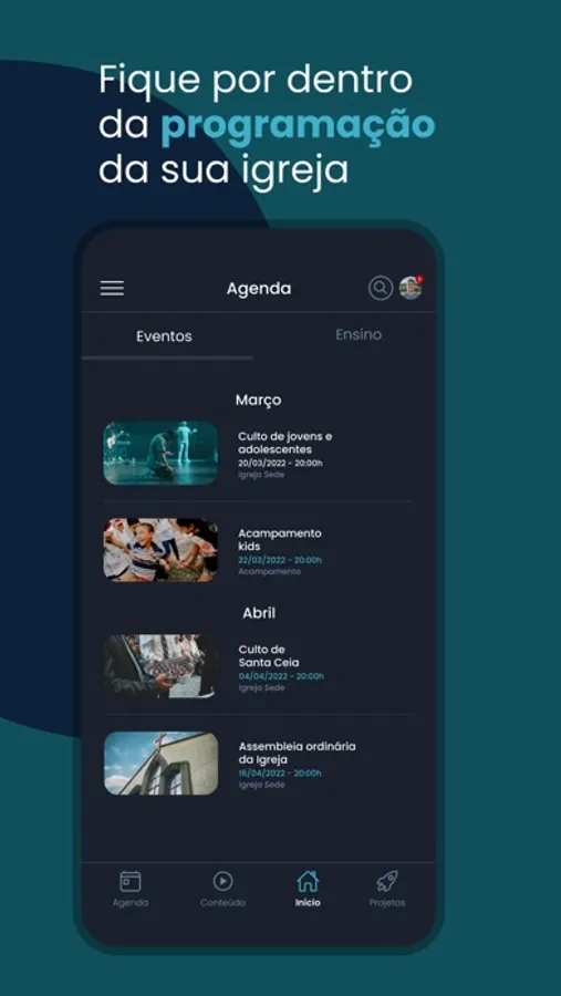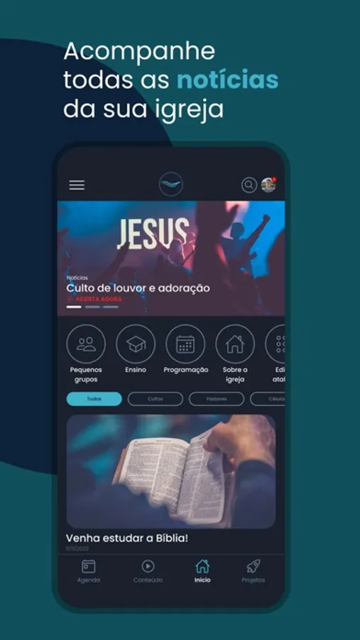 Recursos disponíveis no Aplicativo: Notícias, Agenda da igreja, Eventos, Conteúdos, Projetos, Transmissão ao Vivo e Módulo Ensino.
