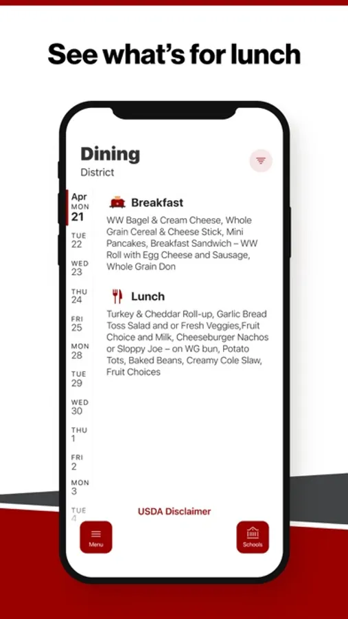 Within the dining section, you'll find an easy to navigate, weekly menu, sorted by day and meal type.