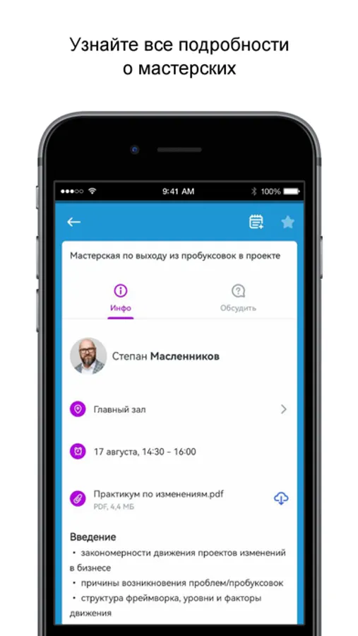 Приложение позволяет следить за расписанием активностей форума, узнавать последние новости в режиме реального времени, получать актуальную информацию, общаться в чате и задавать вопросы.