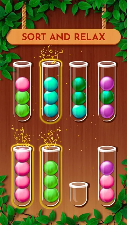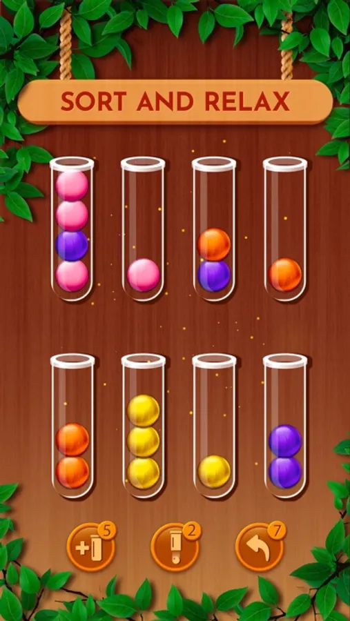 Woody Sort: Ball Sort Puzzle game features natural-looking graphics with wooden textures and a woodoku atmosphere. Sort the colored balls with the ultimate zen experience of the game's beautiful rustic graphics. Also, take a fresh look at the sort games genre with leaves, wooden signs, and shining particle effects.