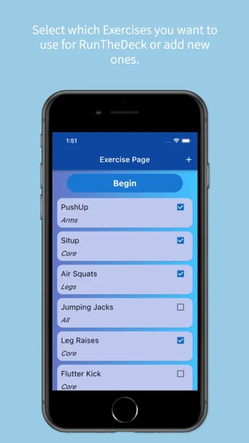 This app is based upon an old method of randomizing exercises using a deck of cards. Instead of using a deck of cards, just select the various exercises you want to randomize and let the play begin. You can share the history with your friends for the ultimate bragging rights!