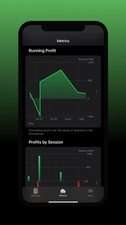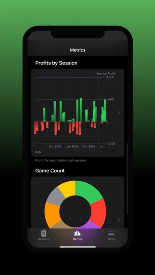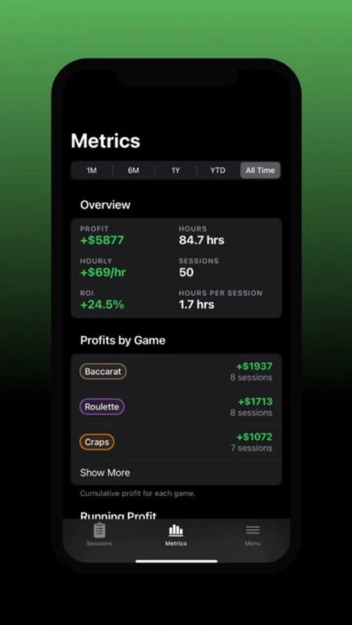 CasinoIQ simplifies the process of recording essential details like date, duration, net profit, and location for each of your casino sessions. No more scribbling notes on paper or using clunky spreadsheets or even worse – not tracking your sessions at all!