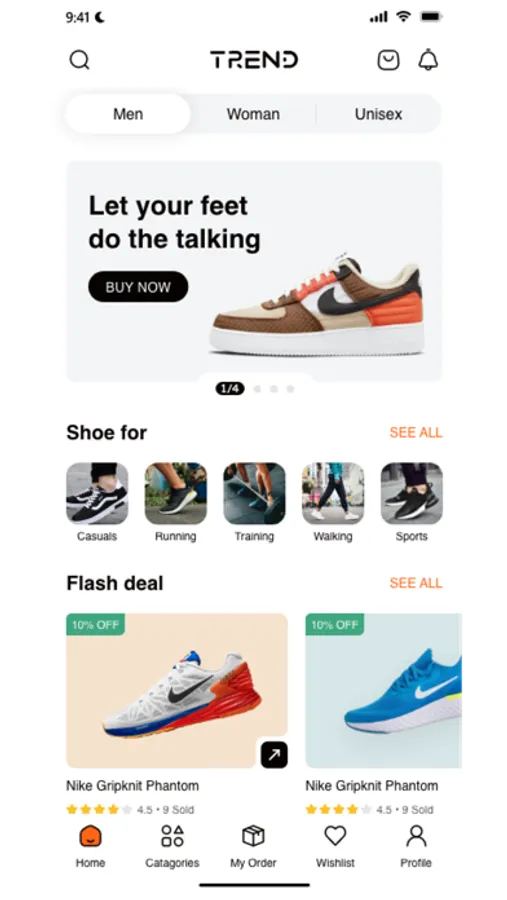 Our user-friendly app interface ensures a seamless shopping experience. Easily browse through categories, apply filters, and find your dream shoes with just a few taps. With Trend, shopping for shoes has never been so effortless!