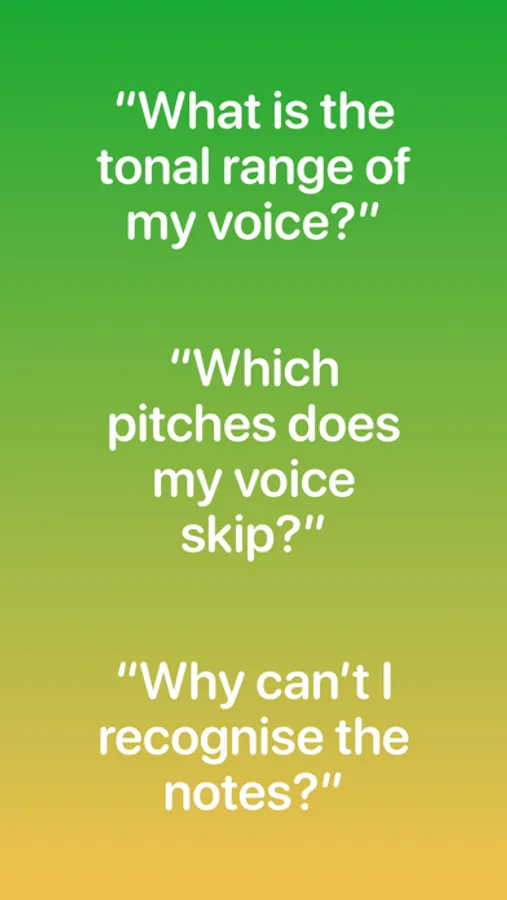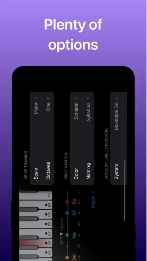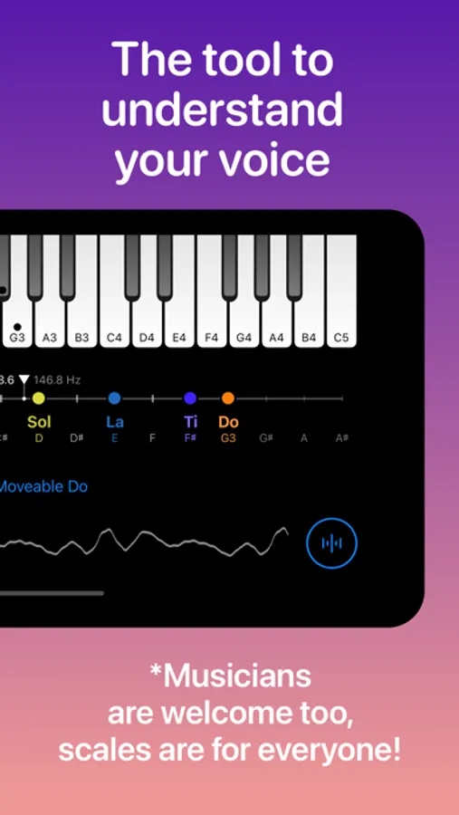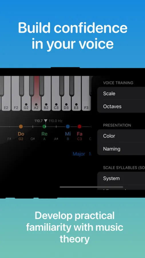 The Sing Scales app is a flexible voice measurement tool. The user can practice singing solfège syllables of Do-Re-Mi-Fa-Sol-La-Ti or any sequence of syllables of choice. For example, singing a scale in La-La-La requires a superb tuning of one’s vocal cords.