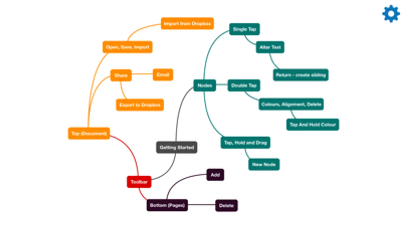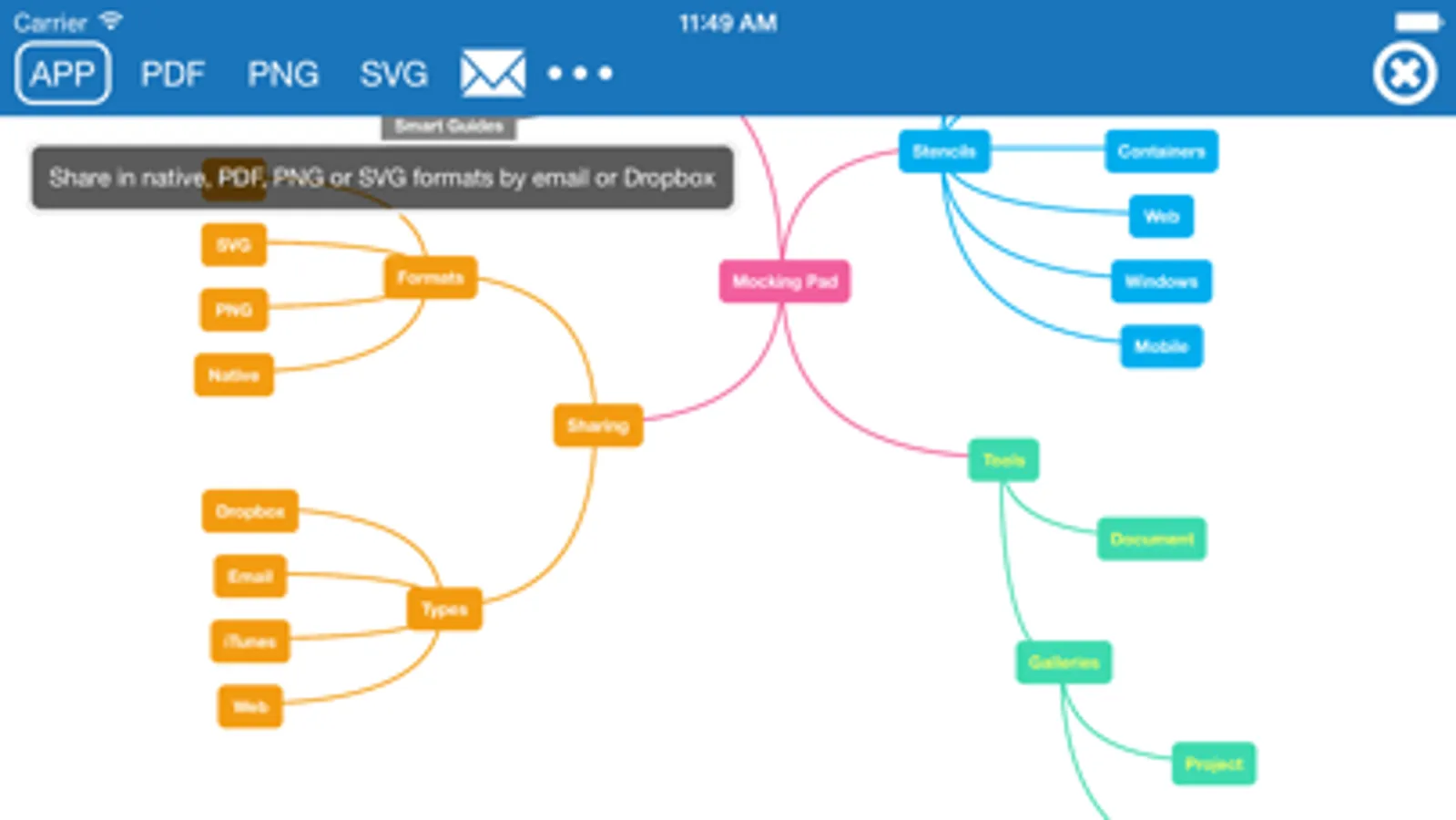 Use email and third party storage providers such as DropBox through the document picker to share your ideas with friends, colleagues and clients in a variety of popular file formats including PNG, PDF, SVG and Fluent Mind Map's native format. You can also save your Mind Maps as images directly to the photo library.