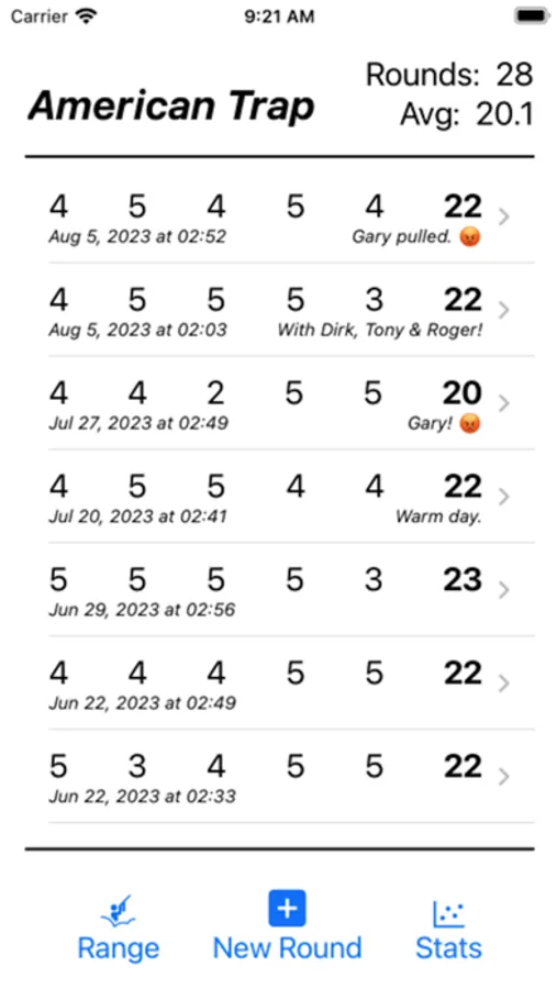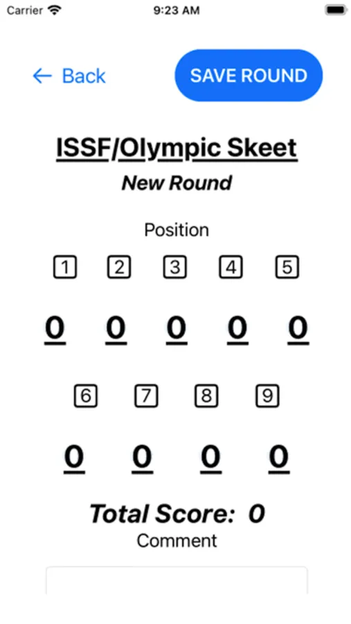 On the phone, tap the "Range" button to select the range you're shooting and then tap "New Round" to enter the scoring for that round. A comment can be added as well.