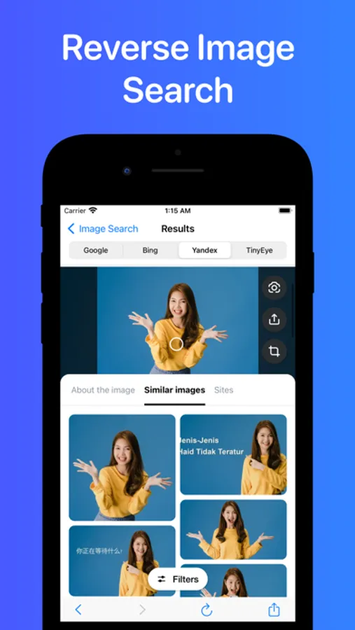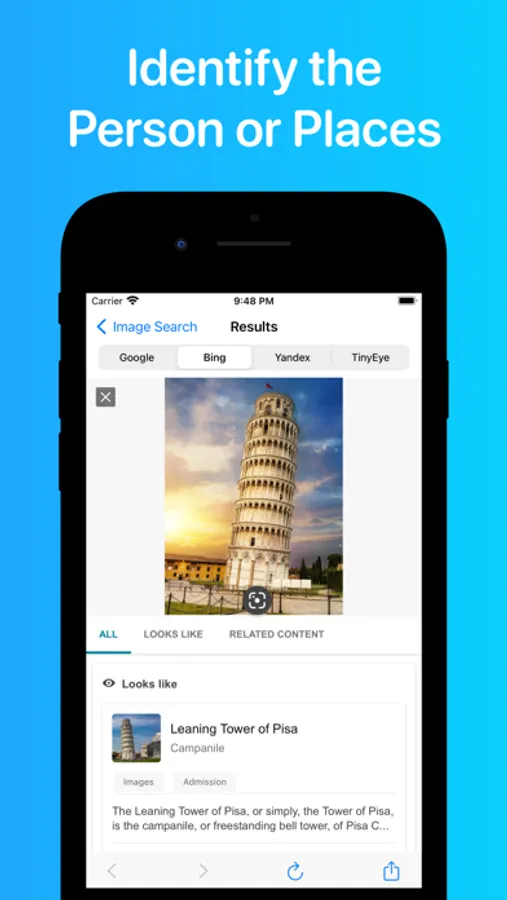 Reverse Image Search allows you to search images across multiple search engines, including Google, Bing, Yandex, and TinEye. With this app, you can: