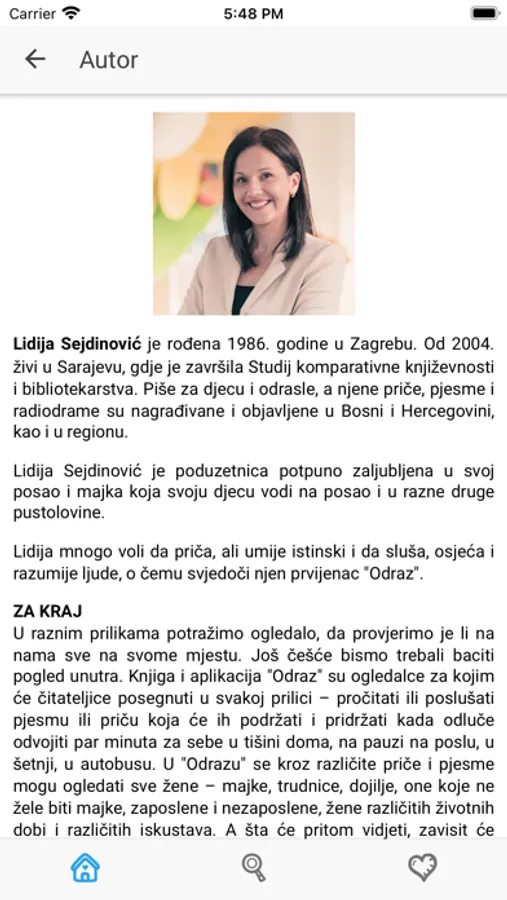 Knjiga i aplikacija “Odraz” su ogledalce za kojim će čitateljice posegnuti u svakoj prilici – pročitati ili poslušati pjesmu ili priču koja će ih podržati i pridržati kada odluče odvojiti par minuta za sebe u tišini doma, na pauzi na poslu, u šetnji, u autobusu.