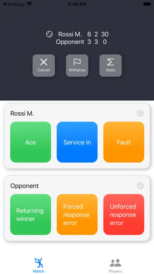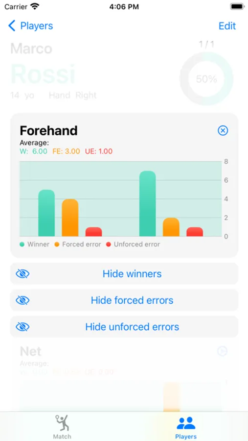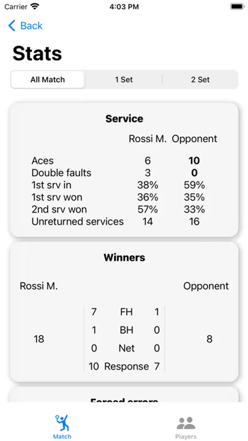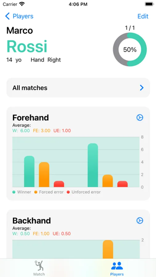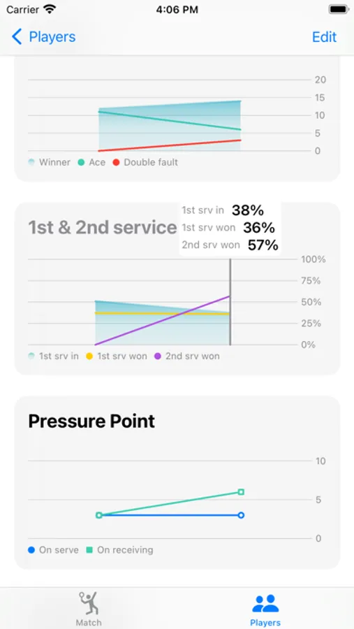 - Automatic creation of graphs for each shot (service, forehand, backhand, volley and return) and the relative outcome (winning, unforced error, etc..). There are also charts for key points such as pressure points, break points, etc.