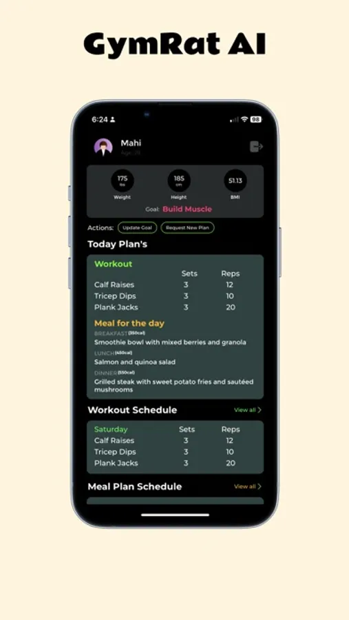 Welcome to Gymrat AI, your ultimate personal fitness coach designed to help you achieve your fitness goals like never before. Whether you're a fitness newbie or a seasoned athlete, Gymrat AI provides tailored workout plans and meal plans based on your body metrics and goals, powered by cutting-edge artificial intelligence and machine learning.