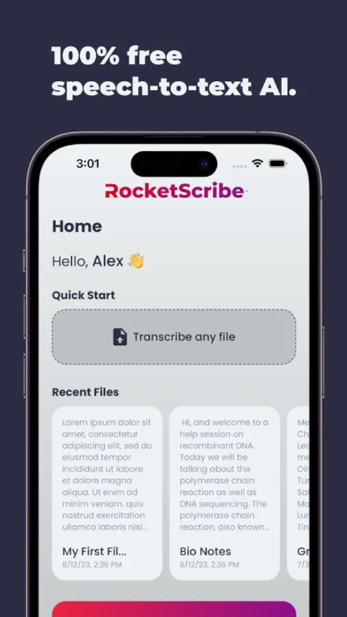 100% free speech to text AI. Transcribe any file or dictate in real-time. Our AI is trained on hundreds of thousands of hours of speech data for world-class accuracy. Inference is made on the Apple Neural Engine for the best speed and performance possible. Your data is never shared with servers. RocketScribe speech-to-text AI runs entirely offline.