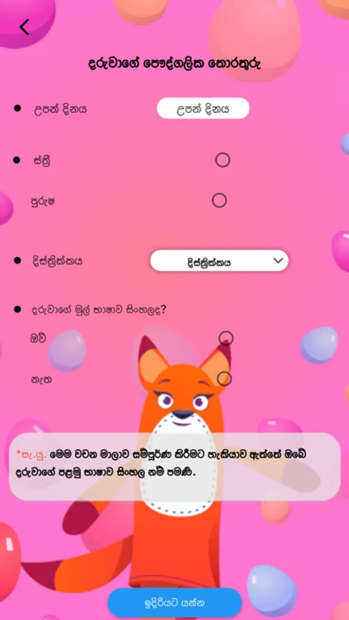 The “ Kathana” app assists parents in finding out about their child’s understanding and production of words in Sinhala. It can be used with children between 12-24 months of age.