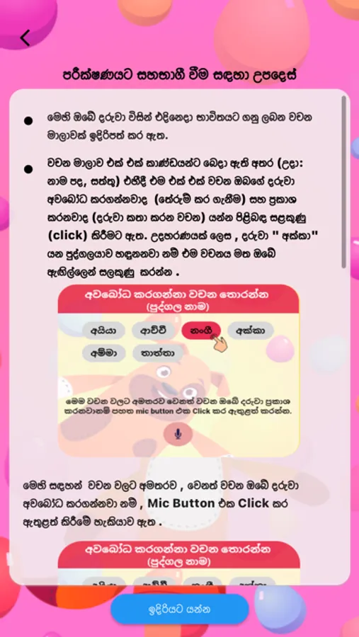 Word lists are provided for each category to test the words your child understands and says in Sinhala. It also allows you to record words to add any additional words that your child understands and expresses that are not included in the original list.