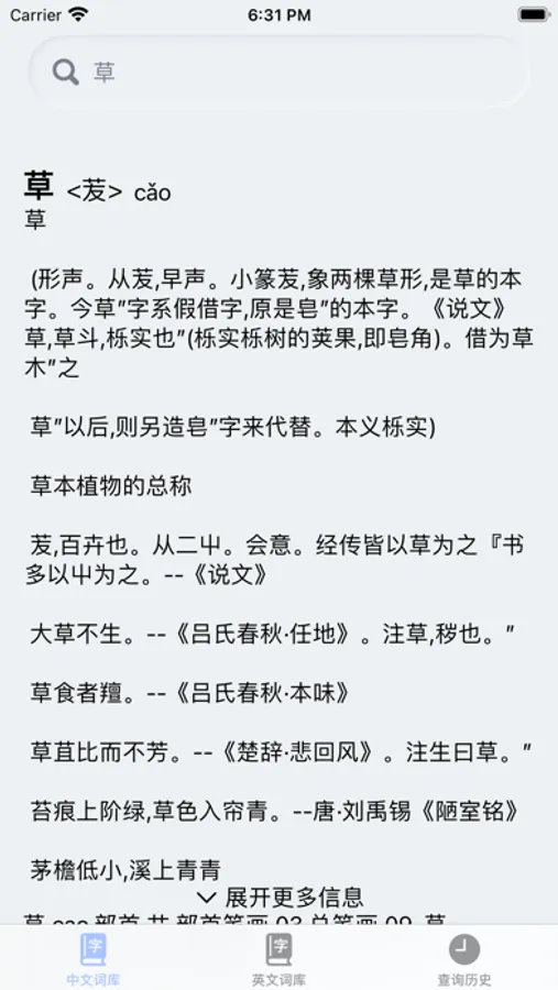 包含中文及英文词典,完全离线,在各地均可查询词语。
