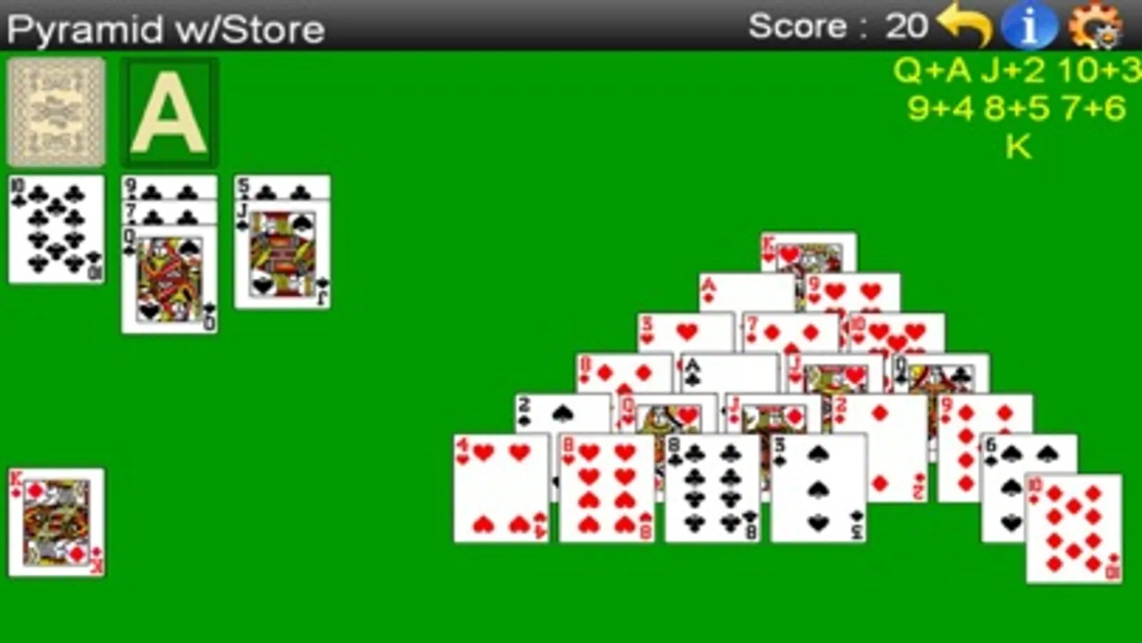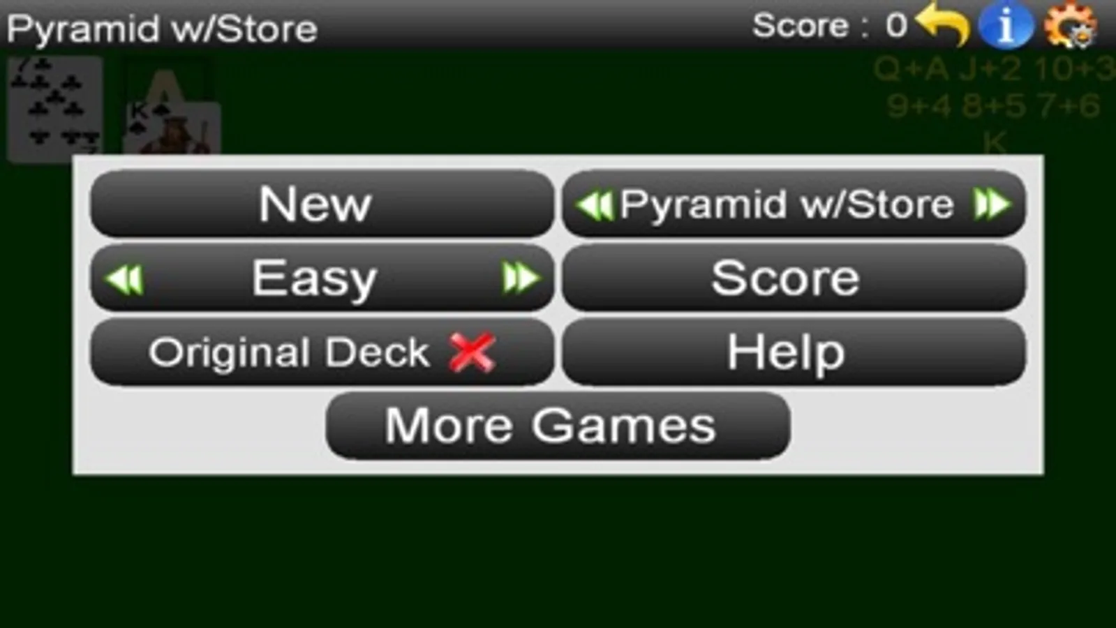 To play, pairs of exposed cards can be removed to the Foundation if their values total 13. Aces count as 1, Jacks – 11, Queens – 12. Kings count as 13 and can be removed on their own. All other cards count at their face value. Cards must not be covered. Thus when an Ace rests on a Queen, that Queen can not be removed. While playing "Temp Store" mode, one card at a time however can be moved to temporary card store (next to stock) to increase your options. You may draw cards from the Stock one at a time and match it with any exposed card.