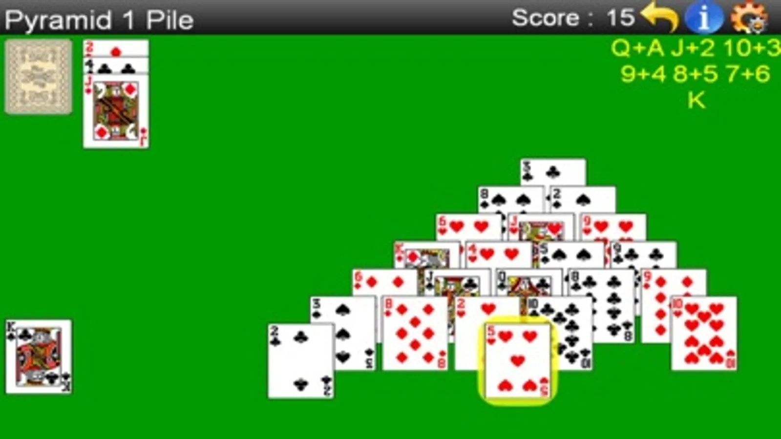 Your goal is to clear pyramid of cards by creating combinations of 2 cards that add up to 13. Pyramid Solitaire is played with a 52-card deck. First, 28 cards are dealt into a pyramid, starting with one card at the top. The pyramid has 7 rows, and the number of cards equals the row position. Each card covers the one on its upper left and upper right (if there are cards in those places). The remaining 24 cards are put in the draw pile. It is possible to put the top card from the draw pile to the discard pile(s), but not backwards. Only the top card of each pile and the exposed cards in the pyramid may be used to make matches. The remaining cards are placed to the side face down. This is the Stock.
