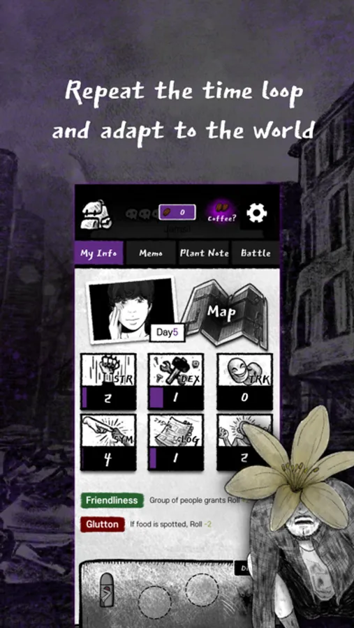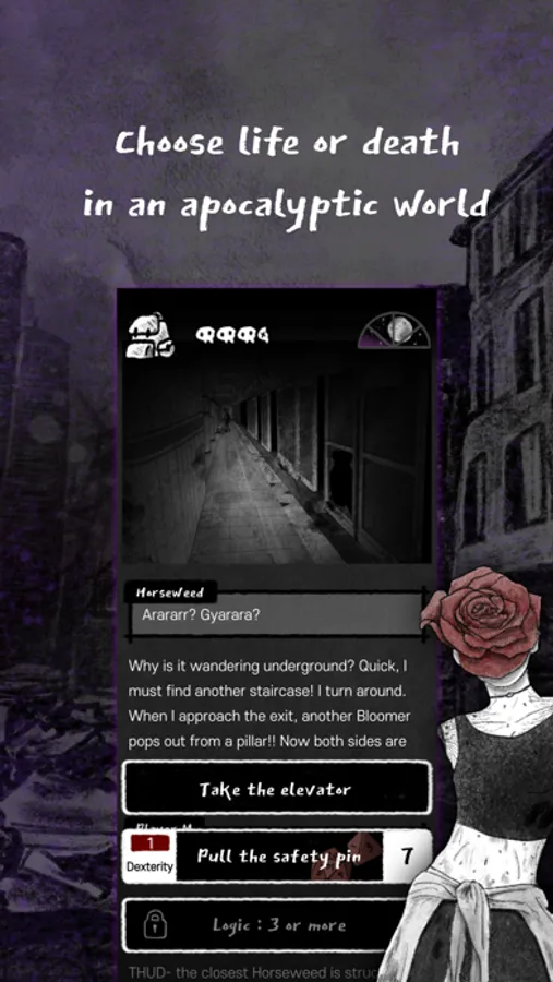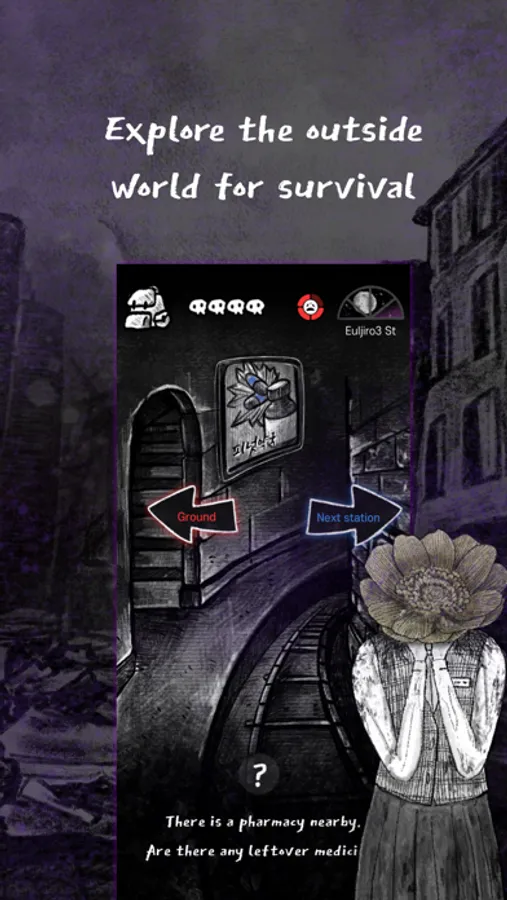 To survive, you must scavenge through empty stores outside the subway. Always be prepared to encounter any Bloomer. You will fight against Bloomers using a lightweight deck building system. Sometimes you must attack, and other times hide, and always return to the station before your mask is damaged. Different types of Bloomers possess distinct characteristics, so be cautious!