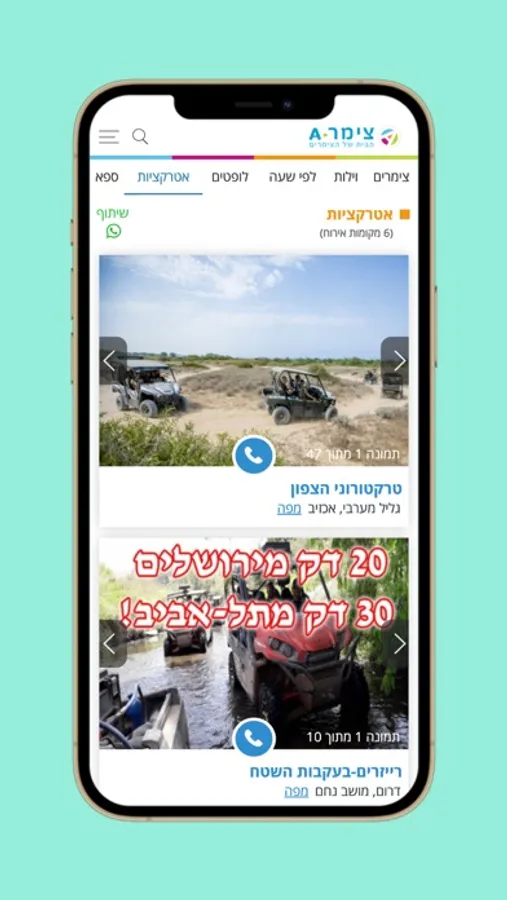 אפליקציית צימר A מביאה את החוויה של מציאת צימרים לרמה הבאה! עם ממשק נוח לשימוש בכל מקום ובכל זמן תוכלו גם אתם למצוא במהירות צימר לנופש מתוך מגוון רחב במיטב הישובים היפים בארץ בדגש על אזור הצפון.