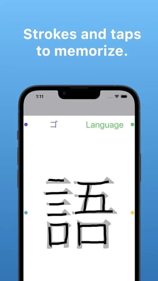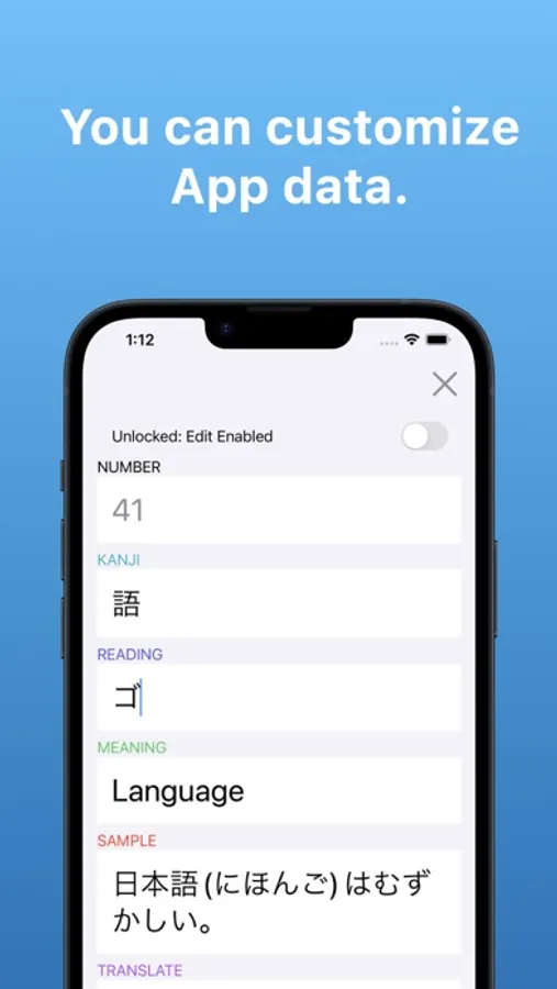 Practice stroke writing, tap to reveal readings, meanings, sample sentences, and translations. Customize with your own data.