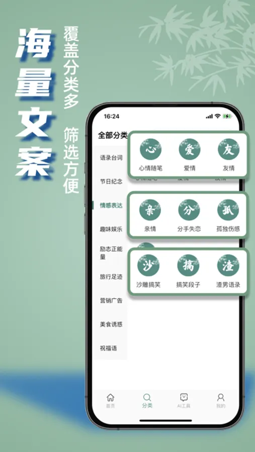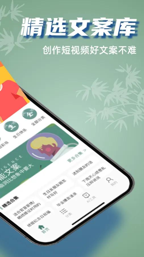 - 短视频文案库:不再为寻找合适的文案而烦恼!我们拥有丰富的自媒体创作文案,励志正能量、情感表达、趣味搞笑、商业思维、营销广告、节日祝福语等,助你事半功倍。