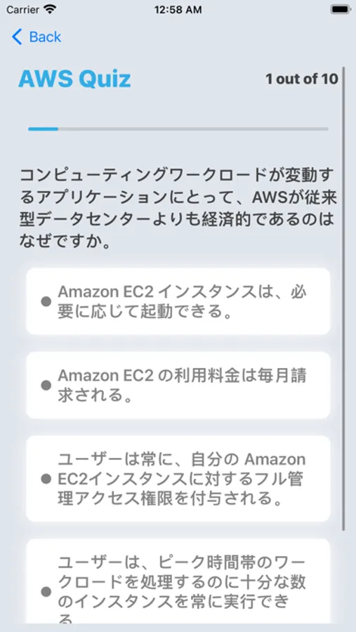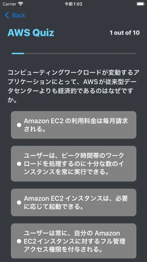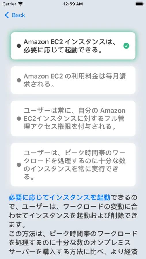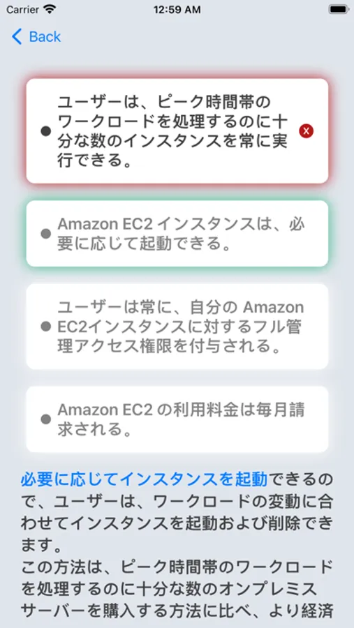 問題が出たら、選択肢をタップしてください。正解の場合は緑に、不正解の場合は赤に光ります。