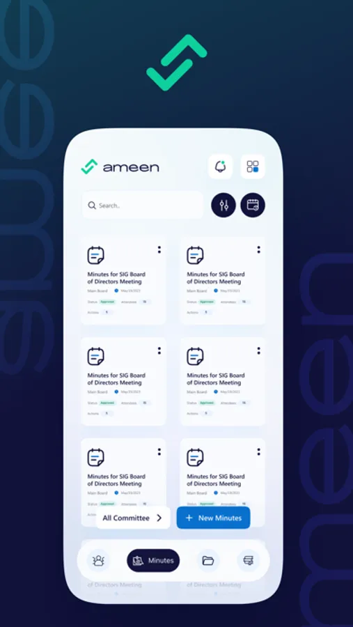 Ameen Board is an app that allows you to register meeting minutes. The app is designed to help you keep track of your meetings and ensure that all important information is recorded. With Ameen Board, you can easily create and manage meetings, add participants, and record minutes. The app also allows you to set reminders for upcoming meetings and send notifications to participants.