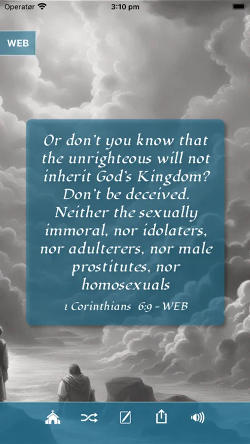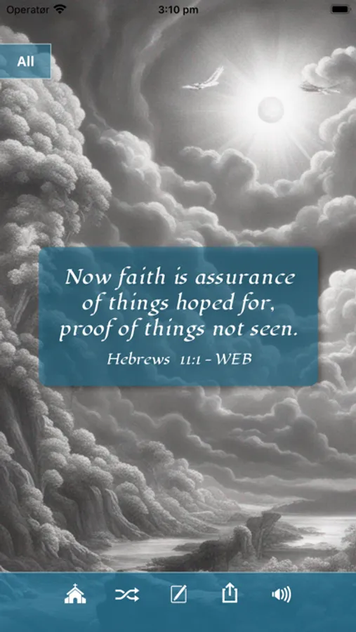Share/download: Download or share wisdom from the Bible as an image with friends and family. Choose spesific Bible verses from different Bible versions and pair it with desired background image. At the moment we have over 300 verses combined from World English Bible and Kin James Version Bible. More verses, Bible versions and images will be added in the future.