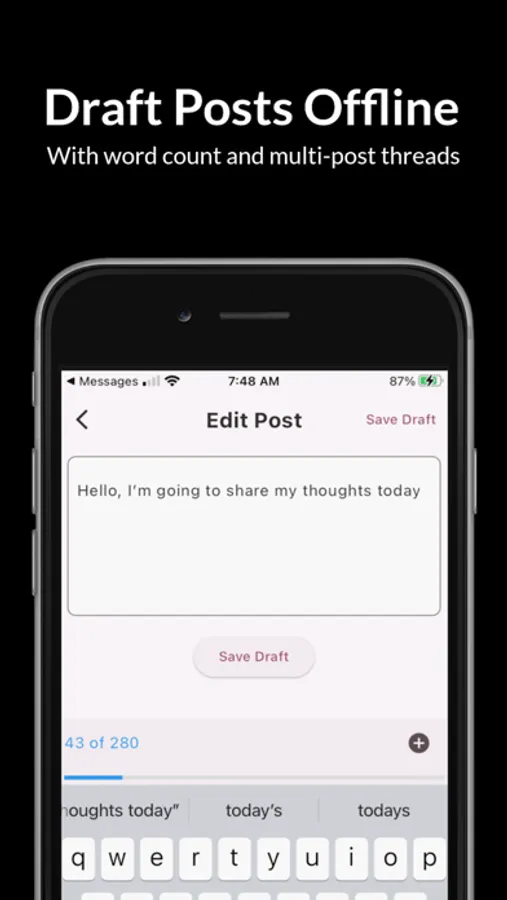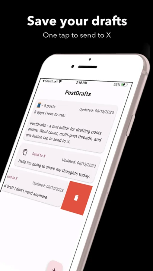 PostDrafts is a simple drafts app for drafting your thoughts on the go. Workshop your thoughts offline, and then send them to X with a single tap.